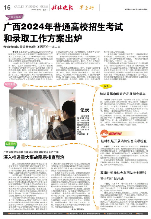 和录取工作方案出炉 考试时间由2天调整为3天 不再区分一本二本   本报讯(记者唐霁云)1月29日,自治区招生考试院发布《广西2024年普通高校招生考试和录取工作方案》(以下简称《方案》),对2024年高考作出了详细规定。根据《方案》,2024年高考考试科目、考试时间、成绩构成、志愿填报、录取规则等均有所调整。