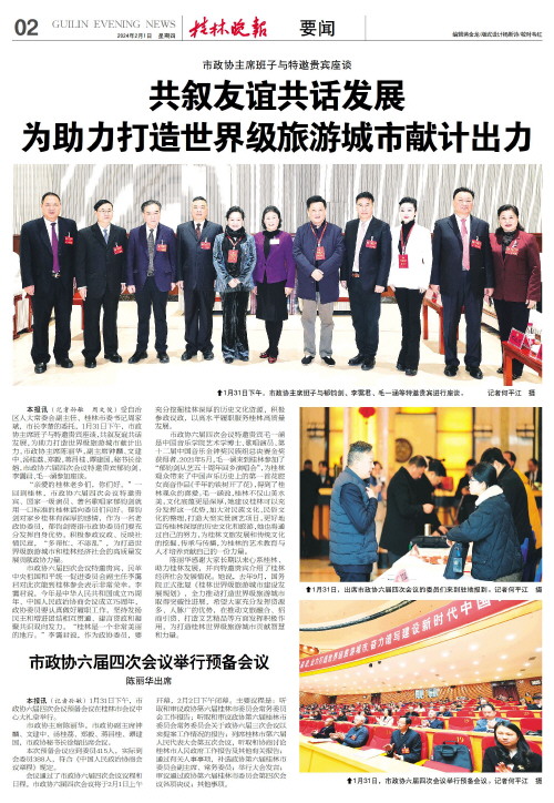 本报讯(记者孙敏 周文俊)受自治区人大常委会副主任、桂林市委书记周家斌,市长李楚的委托,1月31日下午,市政协主席班子与特邀贵宾座谈,共叙友谊共话发展,为助力打造世界级旅游城市献计出力。市政协主席陈丽华,副主席钟麟、文建中、汤桂荔、郑毅、蒋昌桂、谭建国,秘书长徐熔,市政协六届四次会议特邀贵宾郁钧剑、李霭君、毛一涵参加座谈。