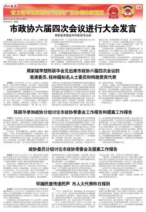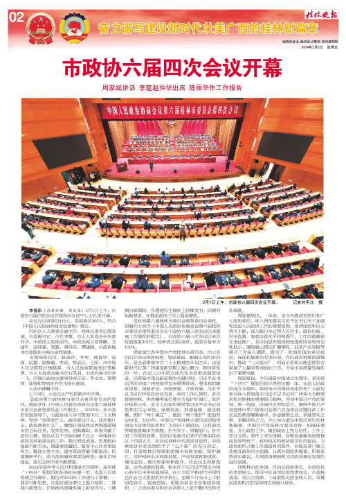 市政协六届四次会议进行大会发言 周家斌李楚赵仲华陈丽华出席   本报讯(记者孙敏 周文俊)2月1日,市政协六届四次会议在桂林市会议中心大礼堂进行大会发言。6位市政协委员围绕桂林经济社会高质量发展和人民群众关心关注的热点问题作大会发言。