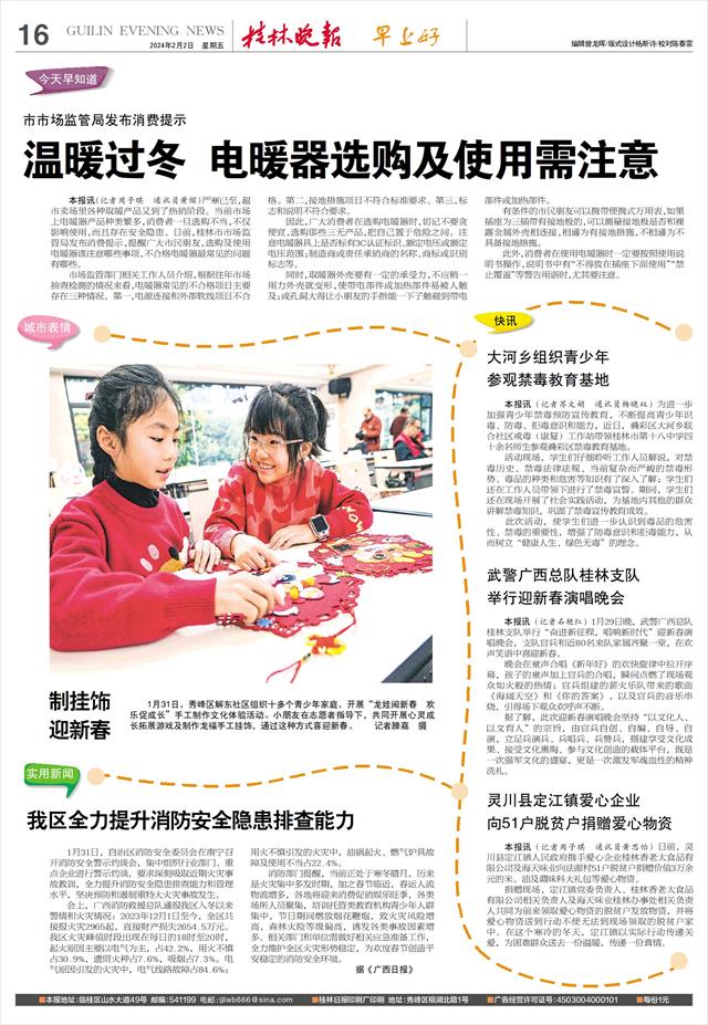 本报讯(记者周子琪 通讯员黄熠)严寒已至,超市卖场里各种取暖产品又到了热销阶段。当前市场上电暖器产品种类繁多,消费者一旦选购不当,不仅影响使用,而且存在安全隐患。日前,桂林市市场监管局发布消费提示,提醒广大市民朋友,选购及使用电暖器该注意哪些事项,不合格电暖器最常见的问题有哪些。