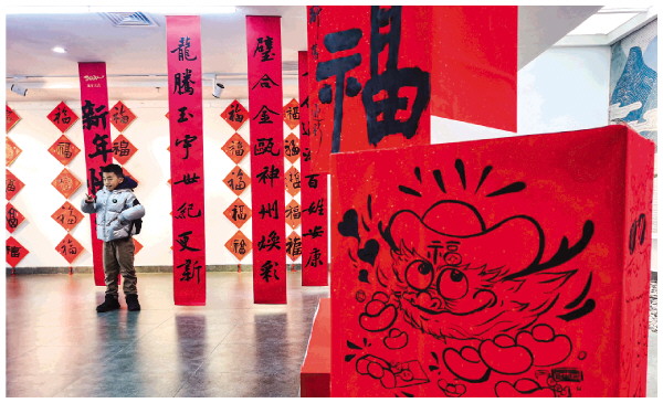 8日,一名小朋友在花桥美术馆的“龙行福至,百福迎春”主题艺术空间展参观拍照。 记者滕嘉 摄