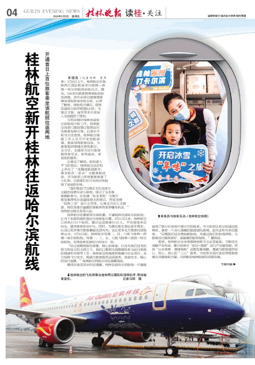 为有序做好桂林往返哈尔滨航线开航工作,桂林航空各部门提前制订航班运行及旅客保障方案。记者在开航当天注意到,桂林航空地服工作人员早早来到航站楼,提前预查旅客信息,为旅客提供便捷化登机指引,全方位、全链条为出行旅客提供更专业、更有温度、更高效的服务。