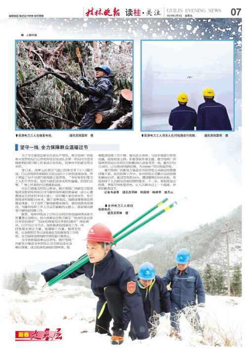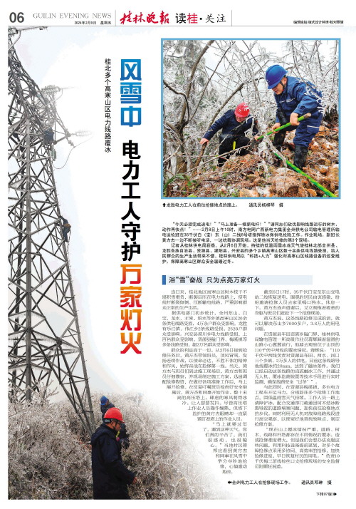 记者从桂林供电局获悉,从2月6日开始,持续的低温雨雪冰冻天气使桂林北部全州县、龙胜各族自治县、资源县、灌阳县、兴安县的多个乡镇高寒山区数十余条供电线路受损,给人民群众的生产生活带来不便。桂林供电局以“科技+人力”强化对高寒山区线路设备的巡查维护,保障高寒山区群众安全温暖过冬。