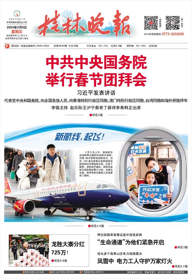2月8日上午,桂林航空在桂林两江国际机场举行桂林-济南-哈尔滨航线启航仪式,当天,100多位旅客从桂林搭乘该航班前往济南或哈尔滨。记者了解到,该航线开通后,桂林往返哈尔滨单程仅需6小时,为南北文旅、商贸等多方面深入交流提供了便利。