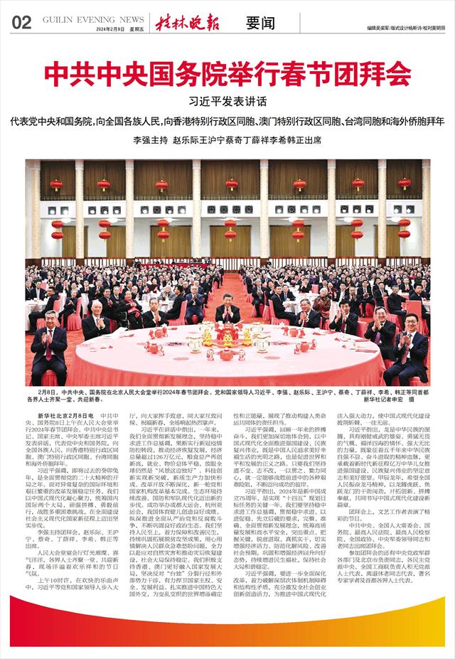 新华社北京2月8日电 中共中央、国务院8日上午在人民大会堂举行2024年春节团拜会。中共中央总书记、国家主席、中央军委主席习近平发表讲话,代表党中央和国务院,向全国各族人民,向香港特别行政区同胞、澳门特别行政区同胞、台湾同胞和海外侨胞拜年。