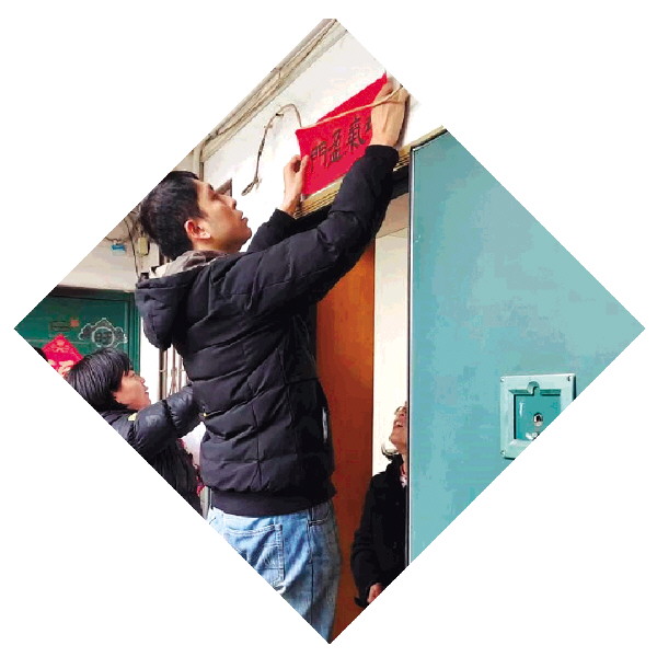 观音阁社区工作人员为居民贴春联。(观音阁社区供图)