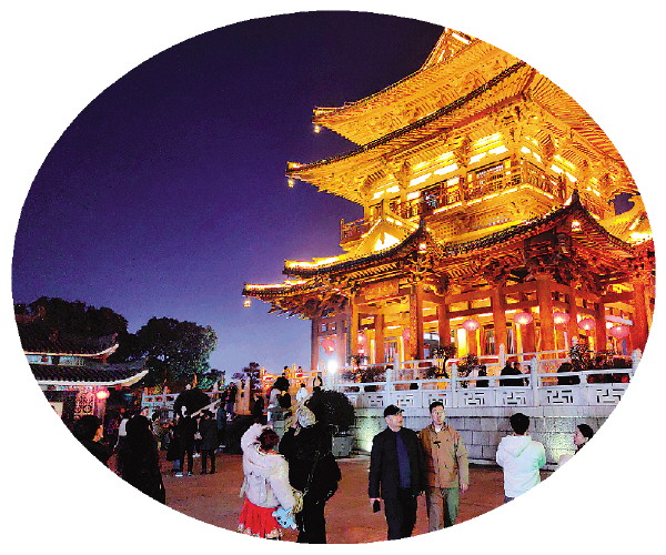晚上,两江四湖人气十足,在日月湾码头,市民游客与身穿民族服装的景区工作人员一起跳舞,热热闹闹过大年;正阳步行街商业街区和东西巷历史文化街区人潮涌动,市民游客漫步街头,或品尝美食或打卡美景或购买礼物。