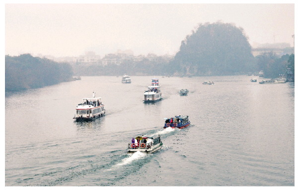 13日,游客乘坐游船在漓江市内段游览,在微微细雨中感受烟雨漓江的魅力。 记者滕嘉 摄