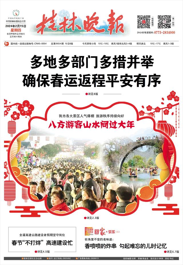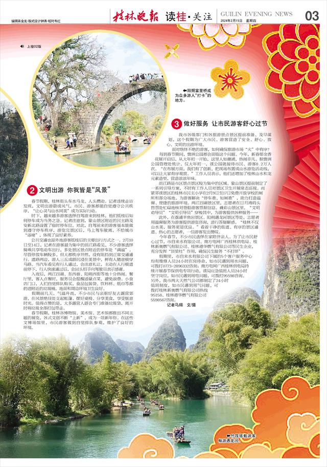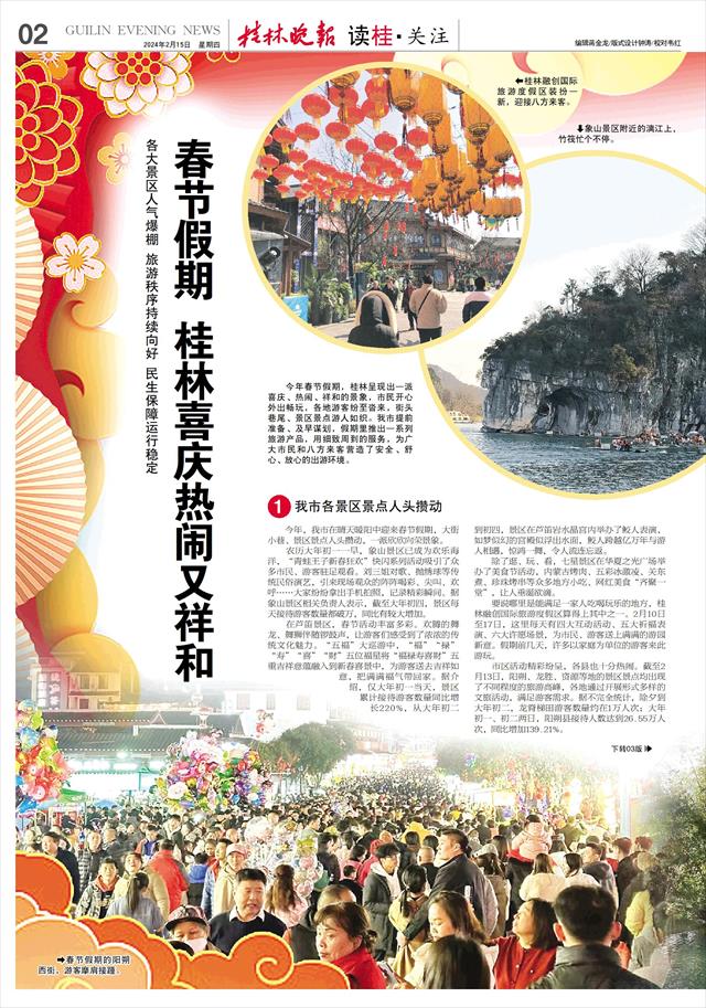 今年春节假期,桂林呈现出一派喜庆、热闹、祥和的景象,市民开心外出畅玩,各地游客纷至沓来,街头巷尾、景区景点游人如织。我市提前准备、及早谋划,假期里推出一系列旅游产品,用细致周到的服务,为广大市民和八方来客营造了安全、舒心、放心的出游环境。