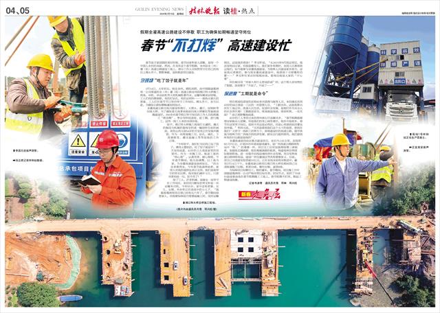 2月14日,大年初五。桂北全州,艳阳高照。由中国能建葛洲坝一公司承建的全(州)灌(阳)高速公路全州段湘江特大桥施工现场,吊机、冲击钻机等大型机械轮番作业,运输车辆来回穿梭,工人们有的绑钢筋、有的打钻孔,有的运材料……一派热火朝天的景象。工人们在春节节日里仍坚守工作岗位,埋头苦干,全力以赴,为确保公路如期畅通加班加点。