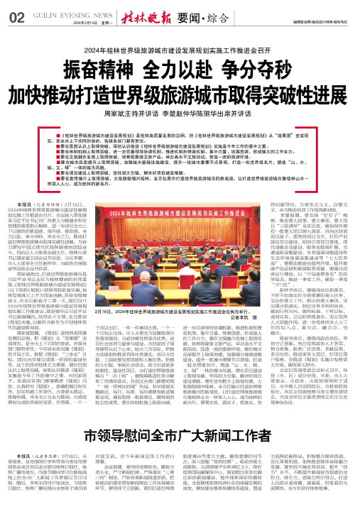 本报讯(记者周绍瑜)2月18日,2024年桂林世界级旅游城市建设发展规划实施工作推进会召开。会议深入贯彻落实习近平总书记对广西重大方略要求和对桂林的重要指示精神,进一步动员全市上下以强烈的紧迫感、责任感、使命感,全力以赴、争分夺秒,举全市之力,推动打造世界级旅游城市取得突破性进展,为奋力谱写中国式现代化桂林篇章而团结奋斗。自治区人大常委会副主任、桂林市委书记周家斌主持会议并讲话,市长李楚、市人大常委会主任赵仲华、市政协主席陈丽华出席会议并讲话。