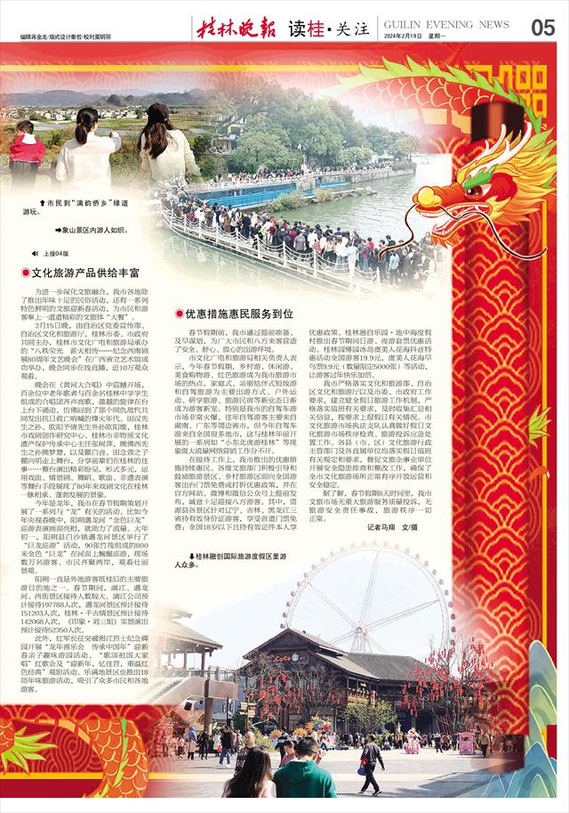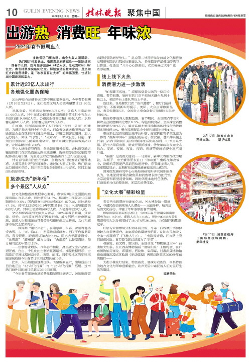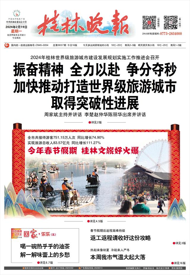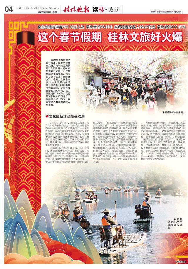 2024年春节假期已告一段落。记者从桂林市文化广电和旅游局获悉,8天假期,桂林文旅市场好火爆,不仅各种活动丰富多彩,为市民、游客送上“旅游盛宴”,也助力文旅市场交出一份亮眼的成绩单。据测算,2024年春节假日期间,全市共接待游客751.15万人次,同比增长74.90%;实现旅游总收入83.57亿元,同比增长111.27%,收获接待人数和旅游收入双丰收。