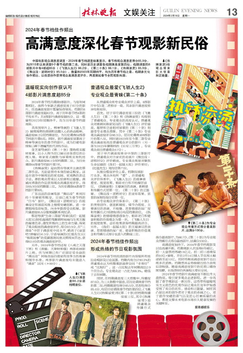 中国电影观众满意度调查·2024年春节档调查结果显示,春节档观众满意度得分85.9分,为2015年以来调查9个春节档的第二名,同时居历史调查各档期满意度第四位。档期调查的8部影片中有4部超85分(《飞驰人生2》86.2分、《第二十条》86.1分、《热辣滚烫》85.9分、《熊出没·逆转时空》85.5分),数量和2023年同期持平,均为历年春节档之最。档期多元化佳作频出,以优质创作获得观众高满意度评价,再度掀起春节全民观影热潮。