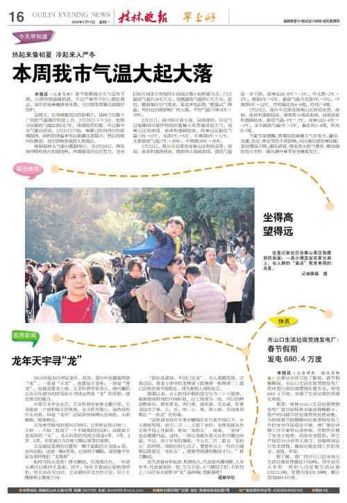 春节期间,我市各县(市、区)各部门、各景区围绕过年习俗,推出赏花、灯展、游园、庙会等一系列丰富多彩的年味旅游活动,吸引了广大游客和市民。文博场馆方面,桂林博物馆持续推出“龙行中华——甲辰龙年生肖文物大联展暨桂林博物馆藏龙纹文物展”“百花迎春——桂林博物馆藏花卉文物图片展”“巧工匠心——华侨博物院藏雕刻精品展”等迎春特展。甑皮岩国家考古遗址公园推出“重温1988年的龙年”怀旧主题公益游园活动,面向社会公众免费开放,假期8天接待游客7428人次。桂海碑林博物馆准备了一系列丰富有趣的精品社教活动,包含非遗传拓体验、寻找石刻中的神龙、打卡龙年心愿墙、石刻中的国宝名碑、如意翻翻龙手工课堂、制作送福挂件、制作拓福斗方等活动,同时推出春节公益讲解服务。桂林美术馆举办“世界的倒影——金江波个展”和“画说桂林——主题美术作品陈列展(中国画篇)”,共接待观众10000人次。