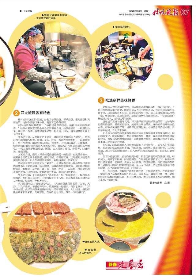 制作油茶有很多流程,“捶打是油茶的灵魂,捶打出来的油茶更香。”桂林市餐饮烹饪协会副会长罗书铭介绍,油茶出锅后,一般搭配炒米、麻旦果、香菜、香葱和花生米等一起食用。如今,越来越多的人爱上了打油茶。
