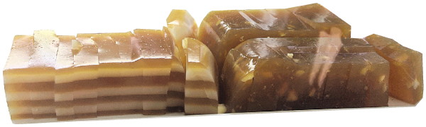 除了蒸熟的马蹄糕,还有一种吃起来有一些软、有一些韧,带着荸荠清香的凉糕,也叫“马蹄糕”。这种马蹄糕也是桂林的特色糕点,它的原材料就是马蹄粉。这种马蹄糕要放凉后吃,外观呈半透明状,口感像果冻。常见的是往里面加入红糖和马蹄果肉,如今也有制作时加入牛奶、椰子汁的,就是牛奶味、椰奶味马蹄糕,此外还有人加入黑米、小米、红豆、绿豆等食材,口味可谓是与时俱进、常出常新。
