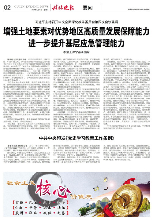 进一步提升基层应急管理能力 李强王沪宁蔡奇出席   新华社北京2月19日电 中共中央总书记、国家主席、中央军委主席、中央全面深化改革委员会主任习近平2月19日下午主持召开中央全面深化改革委员会第四次会议,审议通过了《关于改革土地管理制度增强对优势地区高质量发展保障能力的意见》、《关于促进经济社会发展全面绿色转型的意见》、《关于进一步提升基层应急管理能力的意见》、《关于加快形成支持全面创新的基础制度的意见》、《中央全面深化改革委员会2023年工作总结报告》、《中央全面深化改革委员会2024年工作要点》。