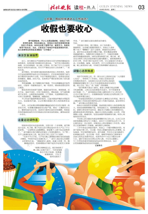 上班第一周如何快速进入工作状态? 收假也要收心   春节假期结束,不少人在朋友圈感慨,在经过了8天的胡吃海喝,熬夜消遣以后,发现自己短时间很难回到最佳的工作状态。身体也出现了肠胃不适,疲劳乏力,焦虑失眠等不良反应。为此,记者采访了桂林市中医医院相关专家,给大家解答如何将自身调整回“工作模式”。