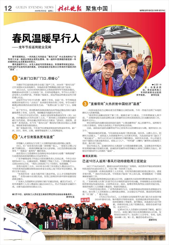 1月25日至4月8日,人力资源社会保障部等九部门联合在全国开展2024年春风行动,集中提供引导有序返岗、促进就近就业和返乡创业、组织招聘用工等服务。春节期间,各地春风行动不停歇,持续举办线上线下招聘活动,帮助劳动者早返岗、企业早开工。