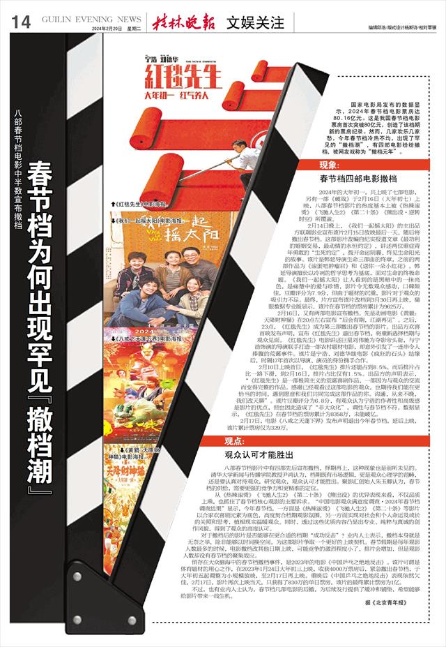 八部春节档影片中有四部先后宣布撤档,择期再上,这种现象也是前所未见的。清华大学新闻与传播学院教授尹鸿认为,档期既有市场逻辑,更是观众心理学的范畴,还是要认真对待观众,研究观众,观众认可才能胜出。聚影汇创始人朱玉卿认为,春节档的供给,需要更强的竞争力和更精准的定位。
