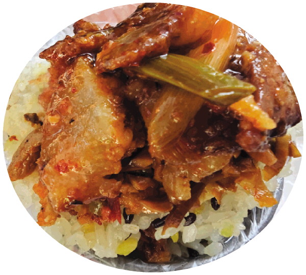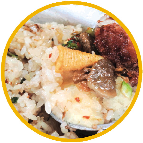 糯米饭在桂林很常见,小学门口、热闹的市中心、小区的楼下都有它的身影。将淘洗干净的糯米拌上油、盐,再上锅蒸熟,就成了制作糯米饭的原材料。而各家糯米饭在放油的时候都有各自独特的“秘方”,有的会用猪油,有的会用花生油,有的两种油都放点,还有的会加一些芝麻油,各种“油”用的分量和比例不同,蒸出来的糯米饭“底味”也就不一样,但它们蒸熟后,都散发着腾腾热气和诱人的香味,每一颗米都油润润的,让人看一眼就有了食欲。