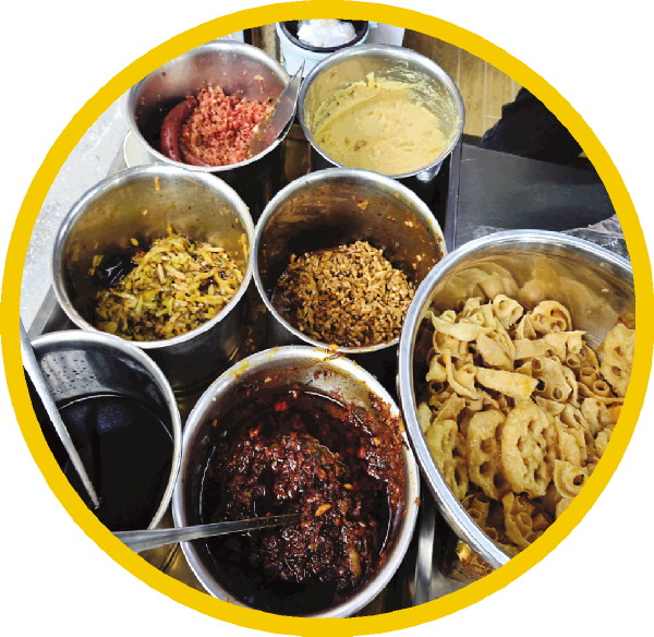 在很多桂林人的记忆里,糯米饭是从小吃到大的美食。直径约7厘米小碗套上塑料袋,用扁平的铁勺舀上一勺蒸好的糯米放在碗里压实,再依次添加绿豆蓉、炸脆片、辣椒酱、辣豆腐丝、牛肉丸、酸豆角、大头菜、萝卜干、腊肠碎等小料,铺满一层再盖上一层糯米,再铺满一层再盖上一层糯米,最后淋上一点卤水。制作糯米饭的人手里的铁勺总能将分量把控得刚刚好,这么多佐料加进去,可以叠上四五层,却又不溢出来,压得不松不紧,取下塑料袋把糯米饭团在手里,轻轻一捏,就成了一个拳头大小的球。