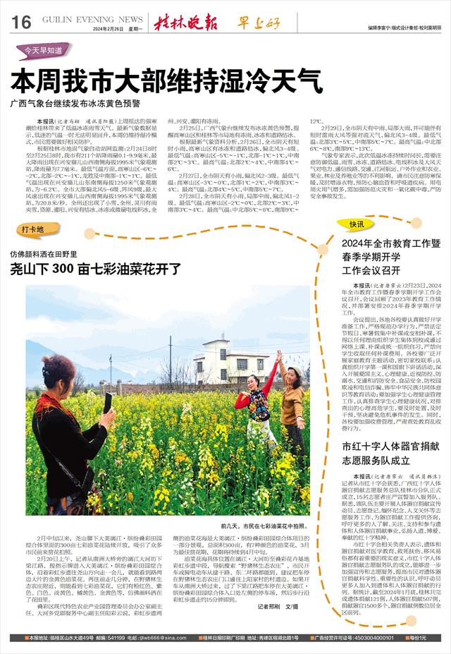 叠彩区现代特色农业产业园管理委员会办公室副主任、大河乡党群服务中心副主任阳彩云说,彩虹步道两侧的油菜花海是大美漓江·缤纷叠彩田园综合体项目的一部分景观,总面积300亩,有7种颜色的油菜花,3月为最佳赏花期,花期将持续到4月中旬。