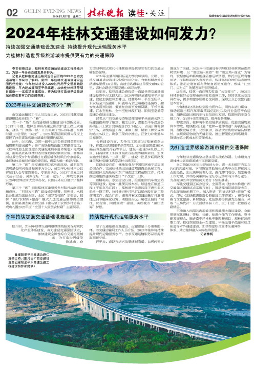 据介绍,2024年桂林交通将继续围绕服务保障现代化产业体系建设,奋力建设交通强区试点,加快建设全国性综合交通枢纽城市,为打造世界级旅游城市、奋力谱写中国式现代化桂林篇章提供坚实有力的交通运输服务保障。