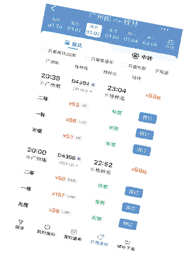 动车方面,记者从12306软件了解到,即日起至3月4日,由广州南开往桂林北的D4384次列车及D4308次列车,全程票价分别为53元及98元,最低折扣达到了3折,二等座票价差最高达到145元。区内贺州到桂林的动车二等座最低也仅需22元,与最高售价相差60元。