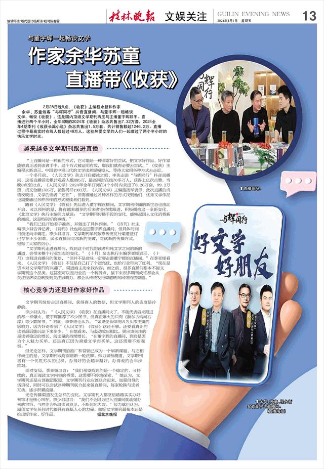 直播带《收获》   2月28日晚8点,《收获》主编程永新和作家余华、苏童做客“与辉同行”抖音直播间,与董宇辉一起畅谈文学,畅谈《收获》。这是国内顶级文学期刊再度与主播董宇辉联手。直播进行两个半小时,全年6期的2024年《收获》杂志共售出7.32万套,2024全年4期季刊《收获长篇小说》杂志共售出1.5万套,共计销售额超1246.2万。直播过程中最高实时在线人数超过48万人,这些热爱文学的人们一起度过了两个半小时的快乐文学时光。