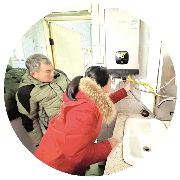 志愿者(右)在马征林家检查燃气安全。 记者谭熙 摄