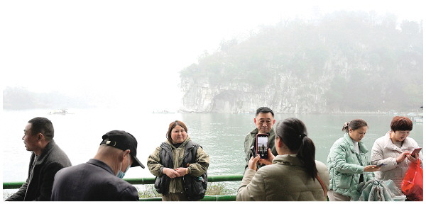 3日,桂林市区下起了雨,漓江上出现了烟雨美景。在象鼻山景区里,游客正在和美丽的烟雨漓江合影留念。 记者滕嘉 摄