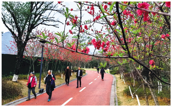 3月6日,桂林天气放晴,不少市民外出欣赏春天美景。图为市民在桃花江滨水步道漫步,盛开的桃花和刚长出的嫩叶让人感受到了春天的勃勃生机。