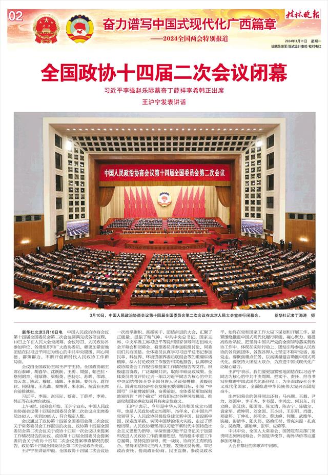 王沪宁发表讲话   新华社北京3月10日电 中国人民政治协商会议第十四届全国委员会第二次会议圆满完成各项议程,10日上午在人民大会堂闭幕。会议号召,人民政协各参加单位、各级组织和广大政协委员,要更加紧密地团结在以习近平同志为核心的中共中央周围,同心同德、群策群力,不断开创新时代人民政协工作新局面。
