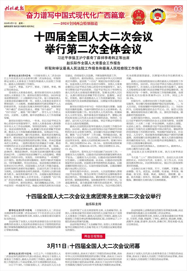 3月11日:十四届全国人大二次会议闭幕   新华社北京3月10日电 11日上午,十四届全国人大二次会议各代表团举行代表小组会议,审议关于全国人大常委会工作报告、最高人民法院工作报告、最高人民检察院工作报告的三个决议草案;召开主席团第四次会议。