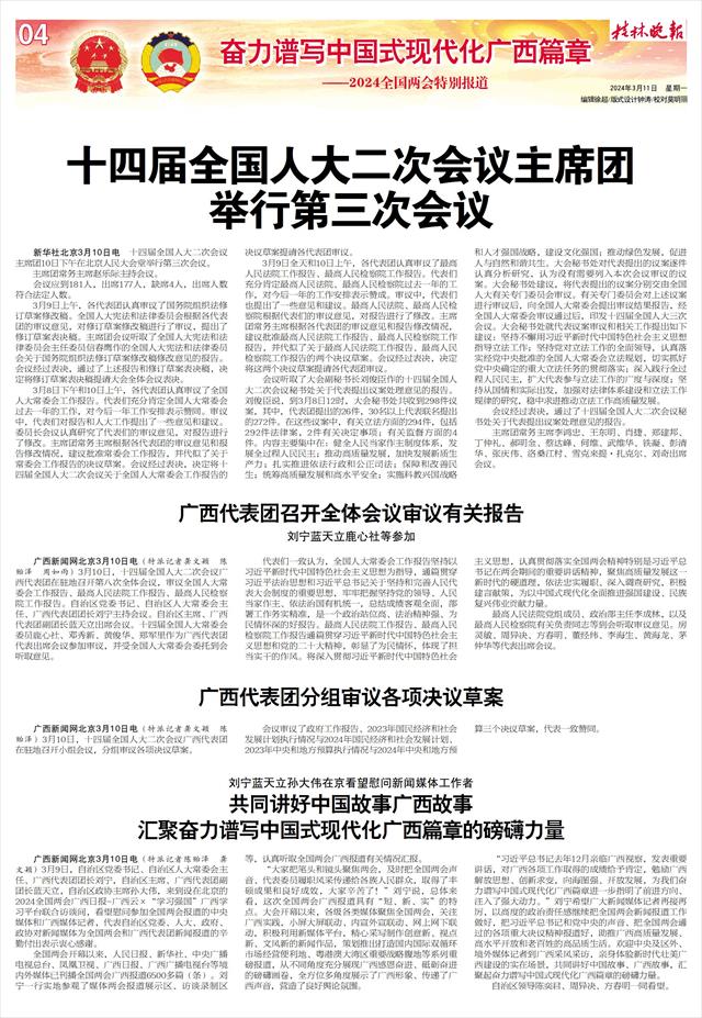 广西代表团召开全体会议审议有关报告 刘宁蓝天立鹿心社等参加   广西新闻网北京3月10日电(特派记者龚文颖 陈贻泽 周如雨)3月10日,十四届全国人大二次会议广西代表团在驻地召开第八次全体会议,审议全国人大常委会工作报告、最高人民法院工作报告、最高人民检察院工作报告。自治区党委书记、自治区人大常委会主任、广西代表团团长刘宁主持会议。自治区主席、广西代表团副团长蓝天立出席会议。十四届全国人大常委会委员鹿心社、邓秀新、黄俊华、郑军里作为广西代表团代表出席会议参加审议,并受全国人大常委会委托到会听取意见。