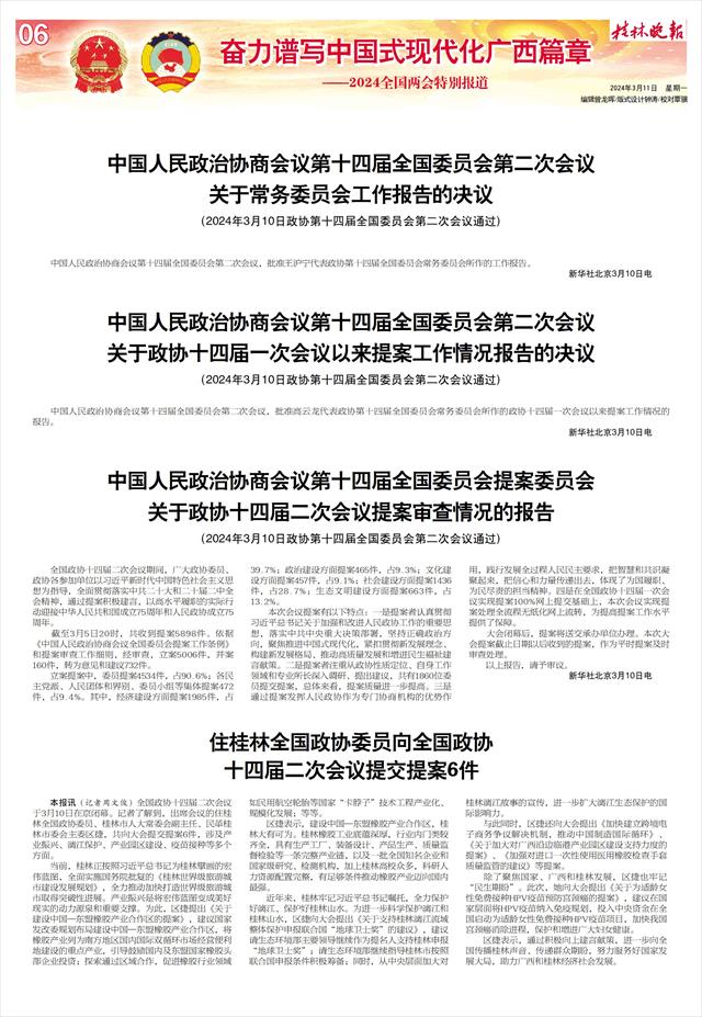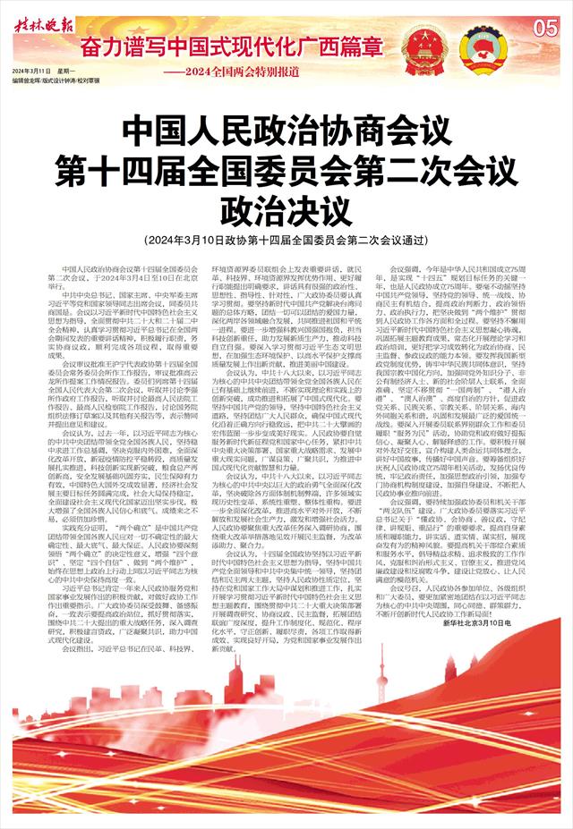 政治决议 (2024年3月10日政协第十四届全国委员会第二次会议通过)   中国人民政治协商会议第十四届全国委员会第二次会议,于2024年3月4日至10日在北京举行。