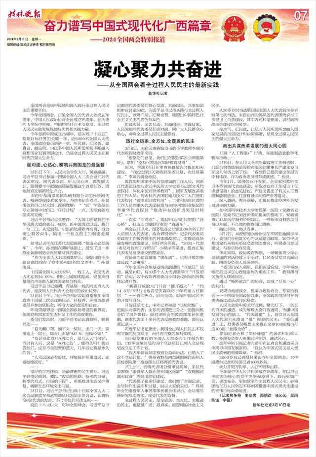 代表们一致认为,全国人大常委会工作报告坚持以习近平新时代中国特色社会主义思想为指导,通篇贯穿习近平法治思想和习近平总书记关于坚持和完善人民代表大会制度的重要思想,牢牢把握坚持党的领导、人民当家作主、依法治国有机统一,总结成绩客观全面,部署工作务实精准,是一个政治站位高、法治精神强、为民情怀深的好报告。最高人民法院工作报告、最高人民检察院工作报告通篇贯穿习近平新时代中国特色社会主义思想和党的二十大精神,彰显了为民情怀,体现了担当实干的作风。将深入贯彻习近平新时代中国特色社会主义思想,认真贯彻落实全国两会精神特别是习近平总书记在两会期间的重要讲话精神,聚焦高质量发展这一新时代的硬道理,依法忠实履职、深入调查研究,积极建言献策,为以中国式现代化全面推进强国建设、民族复兴伟业贡献力量。