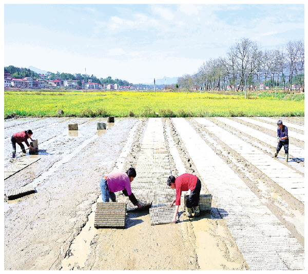 3月12日,在湖南省娄底市双峰县荷叶镇清泉村集中育秧点,农民在秧田劳作。