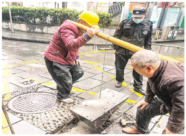 3月16日,天上下着小雨,但为了保证市民游客能有舒适的游览体验,桂林旅丰旅游开发有限公司的工作人员冒雨在中华路进行路面维护,完善旅游基础设施。记者滕嘉 摄