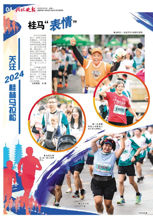 桂马“表情”   昨天2024桂林银行·桂林马拉松的赛场上,3万名选手同场竞技。在追逐更快更强的赛道上,选手们奋力拼搏、破风前行,在赛场上挥汗如雨;而在享受快乐奔跑的过程中,大家则是各显神通,有的身着民族服装,有的一家三口齐上阵……