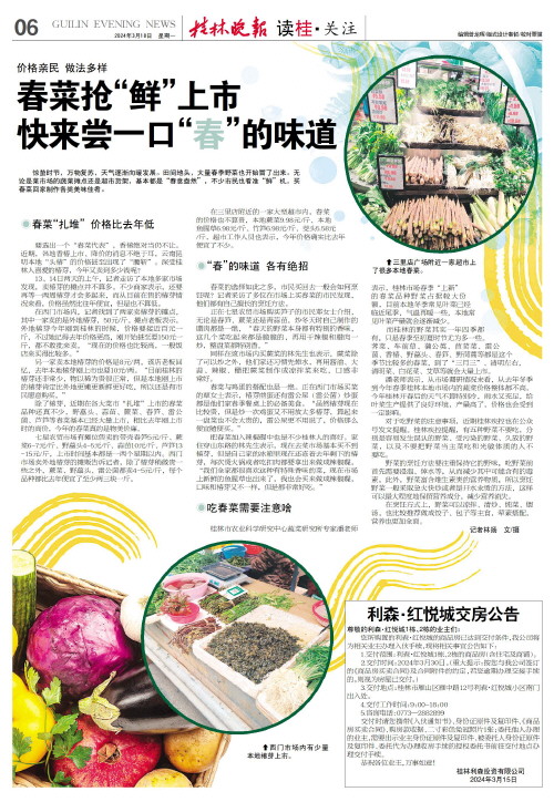 桂林市农业科学研究中心蔬菜研究所专家潘老师表示,桂林市场春季“上新”的春菜品种野菜占据较大份额,目前本地冬季常见叶菜已经临近尾季,气温再暖一些,本地常见叶菜产量就会逐渐减少。