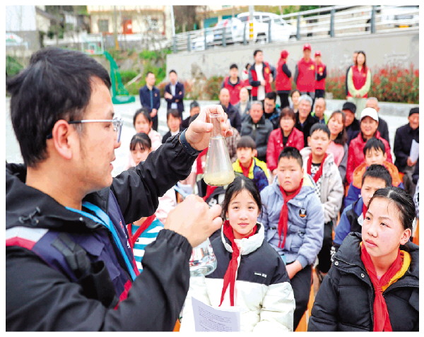 3月20日,四川省华蓥市疾控中心的志愿者在天池湖畔为学生讲解水质常识。