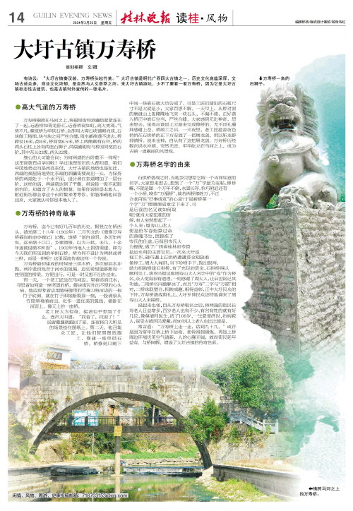有诗云:“大圩古镇秦汉装,万寿桥头起竹黄。”大圩古镇是明代广西四大古镇之一,历史文化底蕴深厚,文物古迹众多,商业文化浓郁,是自然与人文荟萃之所。来大圩古镇游玩,少不了要看一看万寿桥,因为它是大圩古镇标志性古建筑,也是古镇对外宣传的一张名片。