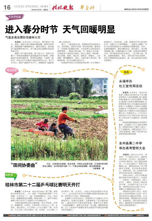 进入春分时节 天气回暖明显 气温走高后需防范森林火灾   本报讯(记者马翔)3月20日,我们迎来了春分。此时,我国大部正掀起回暖浪潮,桂林亦是如此。根据最新气象数据显示,截至本周末,我市最高气温将飙升到27℃,而气温走高后需要注意防范森林火灾。