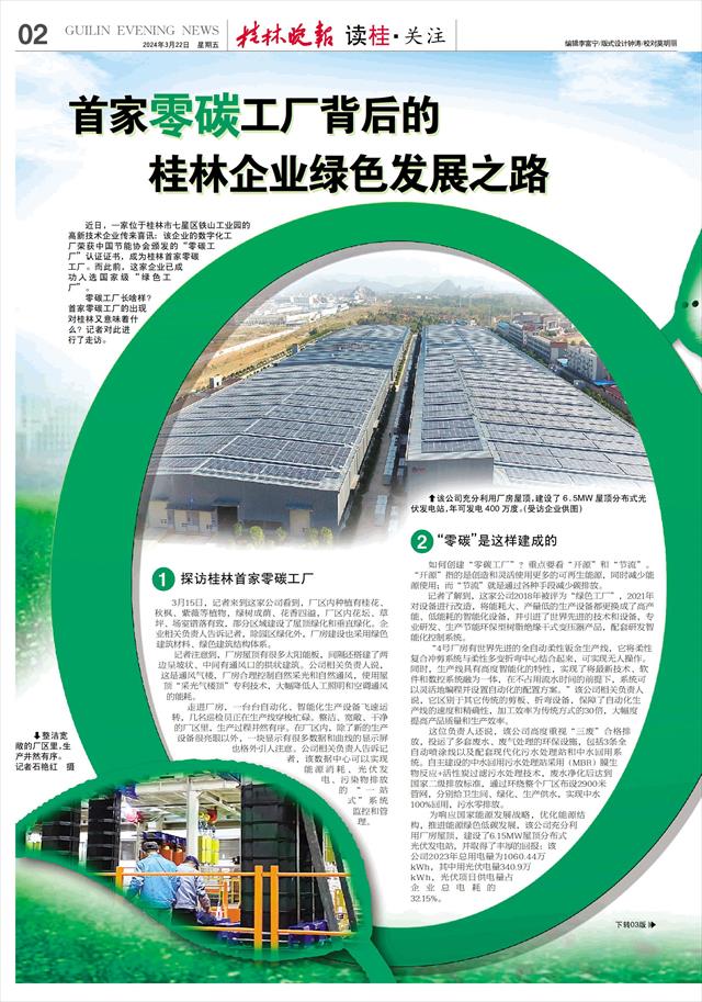 首家零碳工厂背后的桂林企业绿色发展之路   近日,一家位于桂林市七星区铁山工业园的高新技术企业传来喜讯:该企业的数字化工厂荣获中国节能协会颁发的“零碳工厂”认证证书,成为桂林首家零碳工厂。而此前,这家企业已成功入选国家级“绿色工厂”。