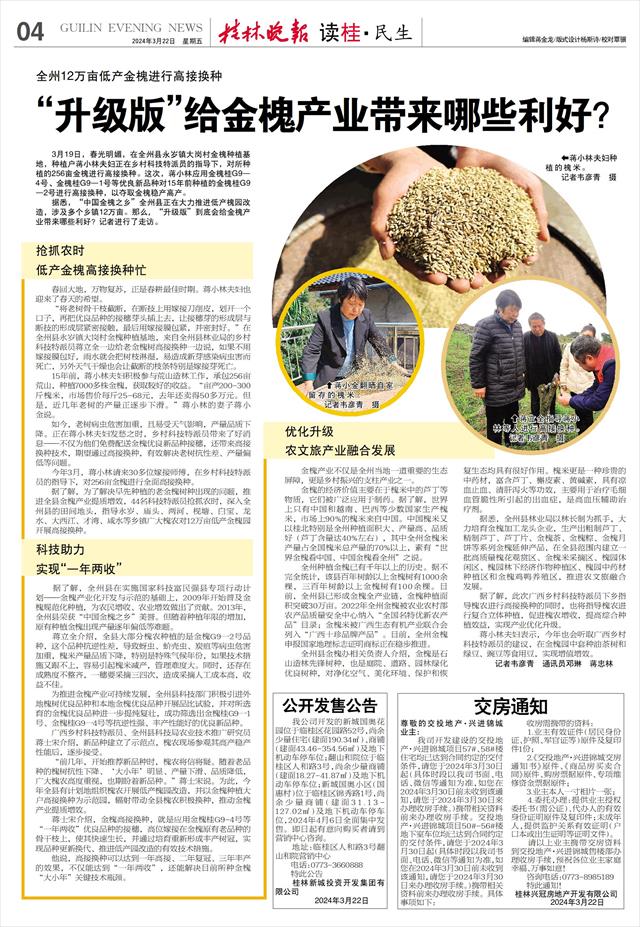 全州12万亩低产金槐进行高接换种 “升级版”给金槐产业带来哪些利好?   3月19日,春光明媚,在全州县永岁镇大岗村金槐种植基地,种植户蒋小林夫妇正在乡村科技特派员的指导下,对所种植的256亩金槐进行高接换种。这次,蒋小林应用金槐桂G9一4号、金槐桂G9一1号等优良新品种对15年前种植的金槐桂G9一2号进行高接换种,以夺取金槐稳产高产。