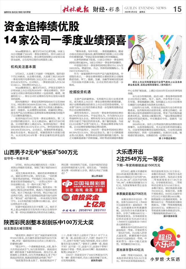 Wind数据显示,截至3月20日记者发稿,16家上市公司披露了2024年一季度业绩预告,其中14家公司预计实现净利润增长。部分净利润预增公司受到市场资金追捧,公告发布后股价出现强劲上涨。