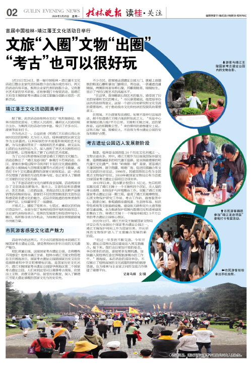 “考古”也可以很好玩   3月23日至24日,第一届中国桂林·靖江藩王文化活动日暨企业家代表招商推介会在我市成功举行。两天的活动内容丰富,既有企业家代表招商推介会,又有著名艺术家的学术讲座,还有参观打卡有奖活动,是靖江王府及王陵国家考古遗址公园文旅融合创新示范的一次新尝试。