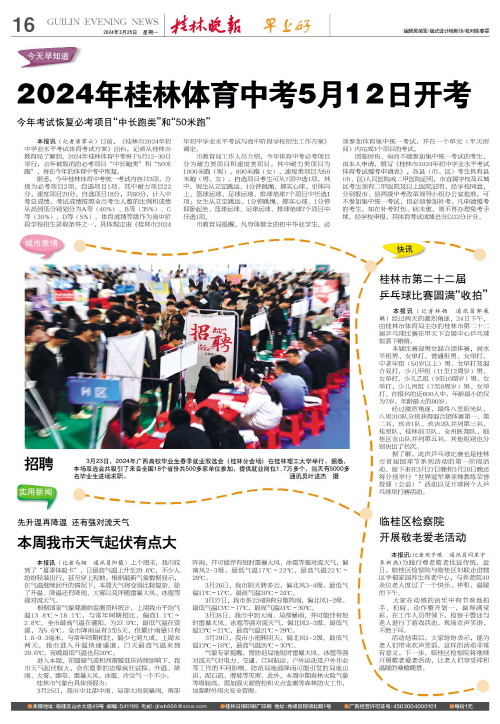 本报讯(记者唐霁云)日前,《桂林市2024年初中学业水平考试体育考试方案》出台,记者从桂林市教育局了解到,2024年桂林体育中考将于5月12-30日举行,去年被取消的必考项目“中长跑类”和“50米跑”,将在今年的体育中考中恢复。